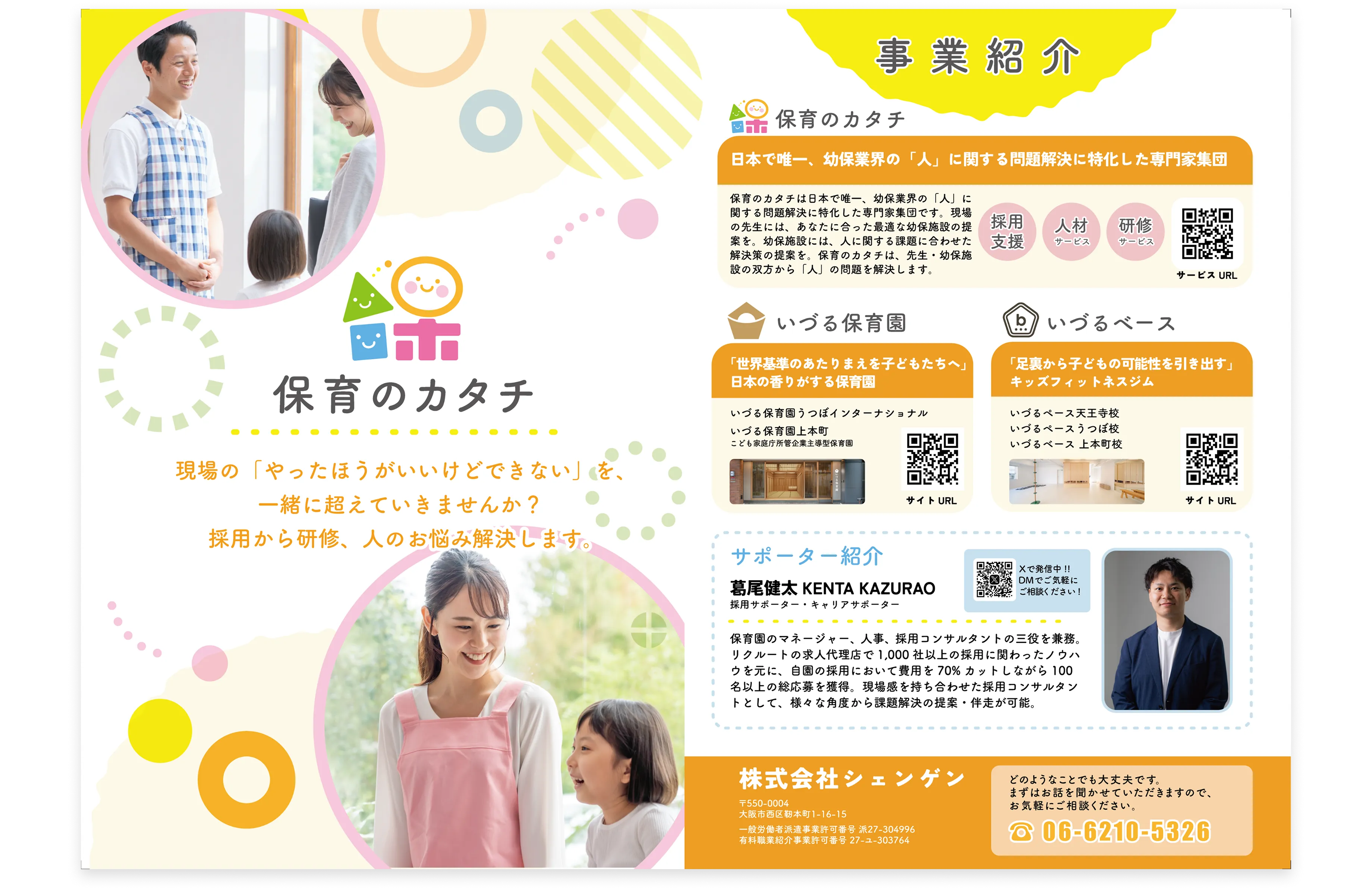 保育系の展示会である「保育博」にて頒布する人材コンサルティングサービスの資料パンフレットを制作しました。