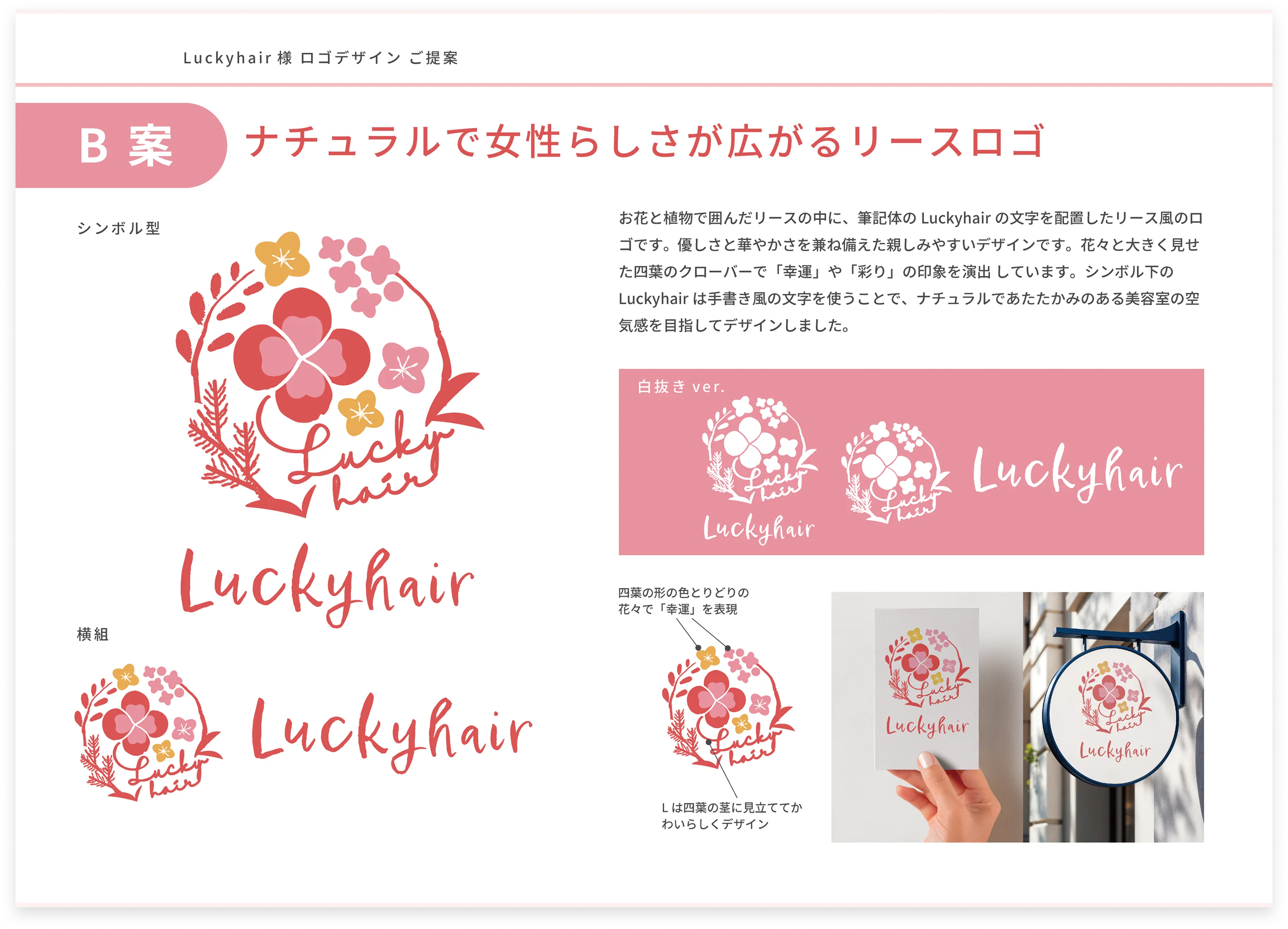 ロゴタイプの「L」をクローバーに見立てたシンボルを中心に、ブランド名全体を柔らかく構成しました。